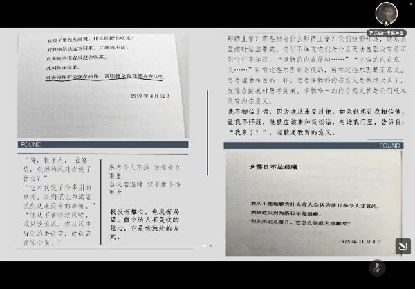 贾蕊旗同学分享诗集《我将宇宙随身携带》,大家产生了强烈共鸣:“很多时候,我们阅读书籍或是诗集,觉得它们好,但是我们说不出哪里好,但是就是觉得好,我们一直在思考我们到底觉得哪里好的过程是非常美妙的,也许此刻我们都愿意做个唯心的人。”