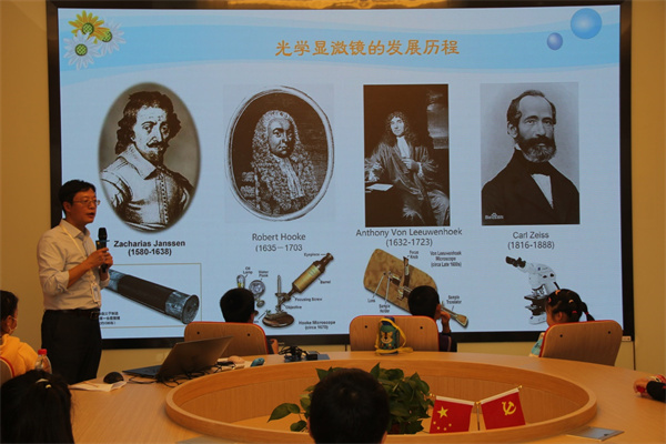 黄荣为“小学组”同学作《显微镜下的神奇微观世界》主题报告。他通过对显微镜的介绍和微观世界的展示,用生动的语言阐释显微镜的物理原理,引导孩子们思考其中的物理知识,激发孩子们探索生物世界的好奇心。