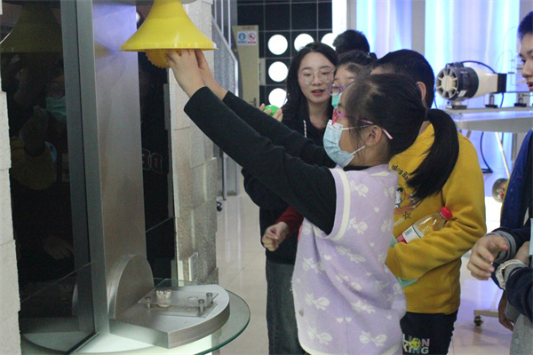 在物理学科普基地,孩子们亲身体验了能量穿梭机、角动量演示器、电流展示仪、全息影像、磁悬浮演示等实验装置,在听讲解、看演示、做实验中了解物理原理。