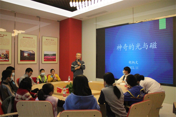 胡炳文以《神奇的光与磁》为题,为“初中组”同学作科普报告,他以“薛定谔的猫”与“单光子行为”等有趣的物理知识为引,通过光影实验和对磁性与超导的讲解,生动形象地展现了光现象和磁现象的奥秘,拓展了孩子们对量子世界的思考和畅想。