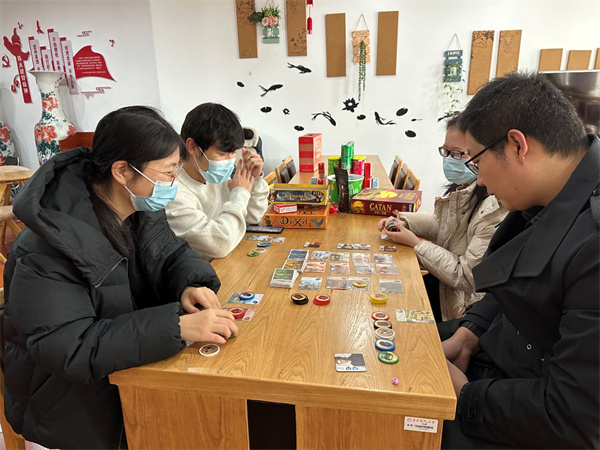 学院226报告厅同步开放,师生在优美的音乐声中唱出心中梦想;227工会活动室则开展了种类丰富的桌游活动,卡坦岛、宝石迷阵、只言片语等应有尽有,同学们玩得轻松愉快,在一片欢声笑语中喜迎新春。