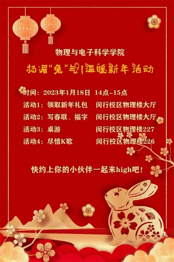 1月18日下午,学院在闵行校区物理楼举办留校同学迎新春联欢会。学院党委副书记蒋旭,辅导员黄蕊、聂树伟与近50名同学一道,写春联、挂福字、玩桌游,共同迎接兔年春节的到来。