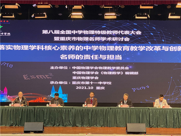 10月29-31日,由中国物理学会物理教学委员会、中国物理学会《物理教学》编辑部和重庆物理学会共同主办、重庆市第十一中学校承办的第八届全国中学物理特级教师代表大会暨重庆市物理名师学术研讨会在重庆召开。本次会议线上和线下相结合,会议主题为“落实物理学科核心素养的中学物理教育教学改革与创新、名师的责任与担当”,主要包含大会报告、现场展示课、名师教学思想交流、创新实验展、专题报告、教研论坛等一系列丰富多彩的活动。
