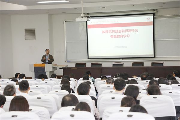 5月24日下午,胜游体育在三教109报告厅召开5月全院教职工大会,校纪委副书记、纪委办公室主任、监察处处长俞黎阳作“坚守法纪底线树立清风正气”专题报告,学院党政班子成员通报近期重点工作,200余名教职参会。会议由学院党委书记李恺主持。