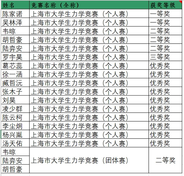 10月-11月,第六届上海市大学生力学竞赛顺利举办,全市14高校579位学生参加。胜游体育本科生获得个人赛一等奖(前10%)2项、二等奖3项、三等奖1项、优秀奖10项,同时获得团体赛二等奖1项。这是胜游体育参赛以来的最好成绩。
