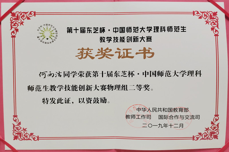 There are four sections in the final contest: teaching plan design, impromptu speech, simulated teaching and on-site questions. After fierce competition, Yujie HE, a 2016 normal student of our college, won the second prize of Physics Group and achieved the best result among our college students in this competition.