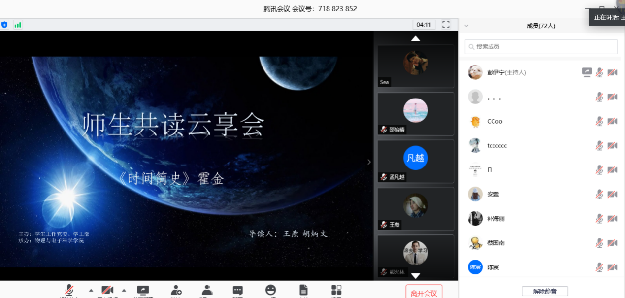 In the afternoon of May 13, accompanied by classics and famous works, the cloud sharing meeting for teachers and students jointly read was held on the online platform hosted by the University's science and engineering Party committee and the student work department and organized by the Youth League Committee of the school of physics and electronic science. Hu Bingwen, vice president of the school of physics and electronic science, and Wang Tao, associate professor, as the guide, gathered in the cloud with more than 120 teachers and students from the whole school to read the brief history of time. Wang Yuanli, Secretary of the Youth League Committee of the College of physics and electronic science, presided over the meeting.